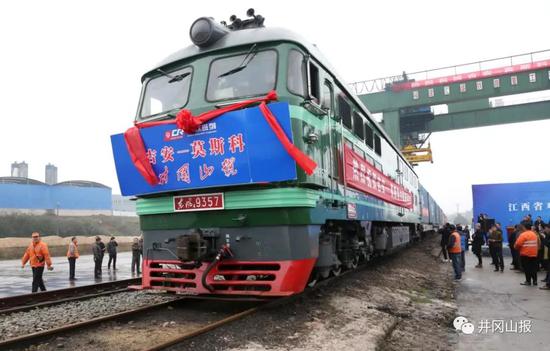12月26日,我市在吉安火車站南站舉行“井岡山號”中歐班列(吉安—莫斯科)首發儀式。“嗚……”上午9時28分,隨著火車汽笛聲響起,吉安至莫斯科貨運列車緩緩向前、順利開行。